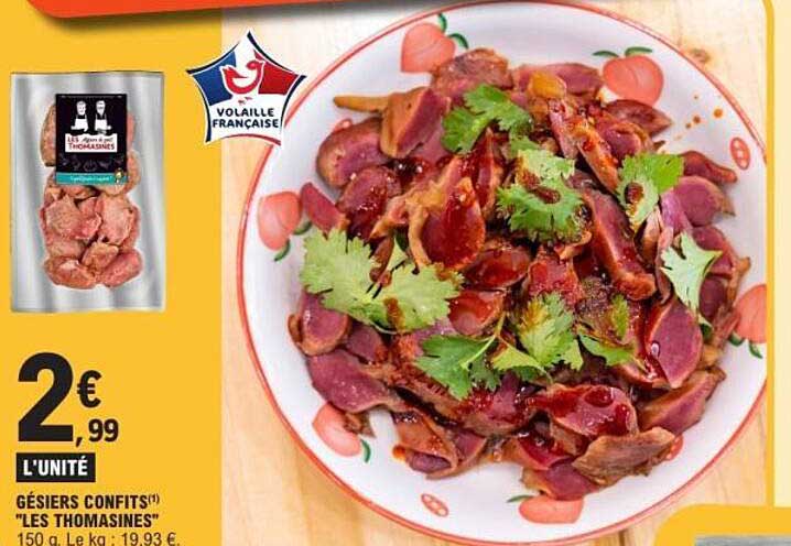 Découvrez l'irrésistible goût des gésiers confits 'Les Thomasines' à petit prix ! En promotion chez E.Leclerc du 4 au 15 novembre 2025, cette offre est idéale pour rehausser vos plats avec une touche authentique et savoureuse. Parfaits pour vos recettes, ces gésiers doivent absolument faire partie de vos courses.