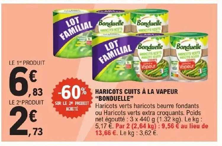 Découvrez dès maintenant la offre HARICOTS CUITS À LA VAPEUR "BONDULLE" dans le catalogue de E.Leclerc. Cette offre est valable du 25/03/2025 au 05/04/2025.