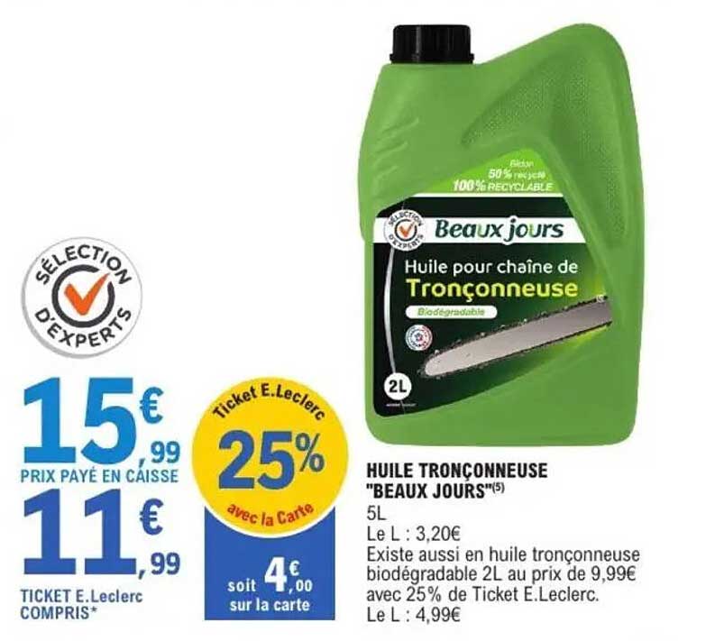 Découvrez l'offre de Huile Tronçonneuse "Beaux Jours" chez E.Leclerc! Cette offre fantastique est maintenant disponible dans le nouveau catalogue de E.Leclerc. Profitez de cette occasion et économisez considérablement sur votre achat.