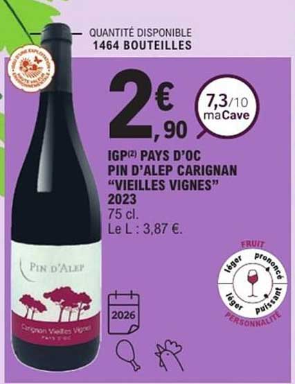 Découvrez l'offre de Igp Pays D'oc Pin D'alep Carignan "Vieilles Vignes" 2023 chez E.Leclerc! Cette offre fantastique est maintenant disponible dans le nouveau catalogue de E.Leclerc. Profitez de cette occasion et économisez considérablement sur votre achat.