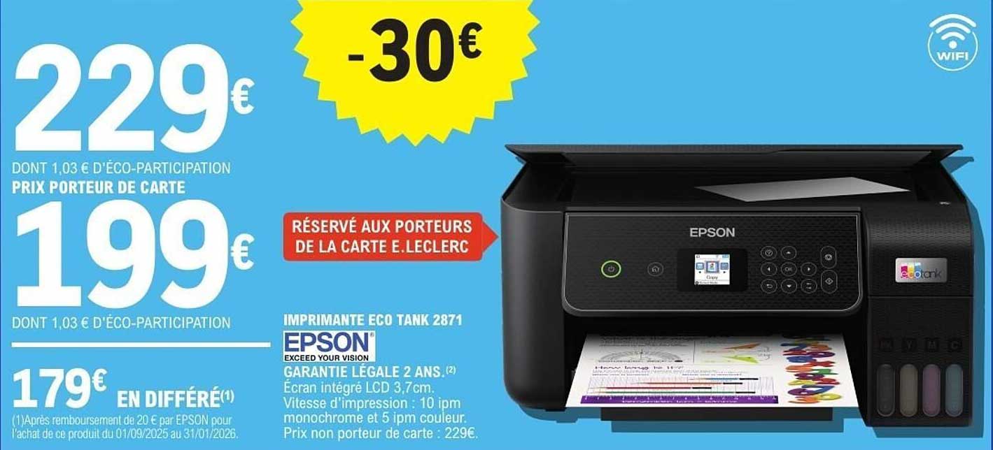 Initialement à 229€, l'imprimante est proposée à 199€ pour les porteurs de la carte E.Leclerc, soit une économie immédiate de 30€. Avec un prix en différé de 179€, cela rend l'offre d'autant plus attractive. Comparée à d'autres modèles sur le marché, l'Eco Tank 2871 se révèle être un excellent investissement à long terme grâce à ses faibles coûts d'impression.