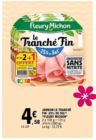 Découvrez dès maintenant la offre JAMBON LE TRANCHÉ FIN -25% DE SEL "FLEURY MICHON" dans le catalogue de E.Leclerc. Cette offre est valable du 15/04/2025 au 19/04/2025.