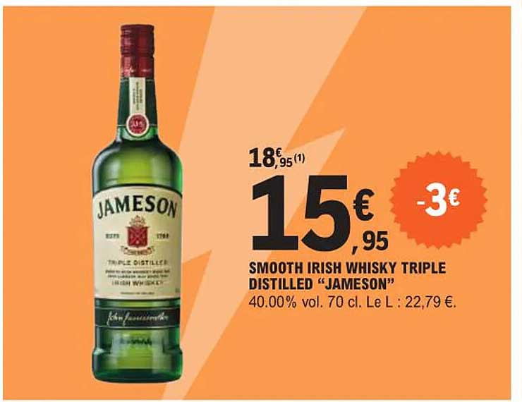 Découvrez l'offre de Jameson Whisky Irlandais Triple Distillé « Jameson » chez E.Leclerc! Cette offre fantastique est maintenant disponible dans le nouveau catalogue de E.Leclerc. Profitez de cette occasion et économisez considérablement sur votre achat.