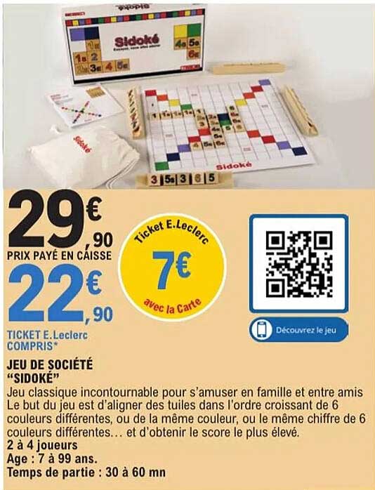 Découvrez l'offre de Jeu De Société "Sidoké" chez E.Leclerc! Cette offre fantastique est maintenant disponible dans le nouveau catalogue de E.Leclerc. Profitez de cette occasion et économisez considérablement sur votre achat.