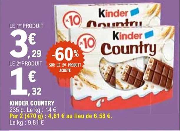 Découvrez l'offre de Kinder Country chez E.Leclerc! Cette offre fantastique est maintenant disponible dans le nouveau catalogue de E.Leclerc. Profitez de cette occasion et économisez considérablement sur votre achat.