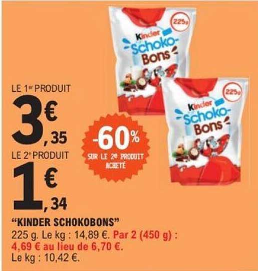 Découvrez l'offre de “Kinder Schokobons” chez E.Leclerc! Cette offre fantastique est maintenant disponible dans le nouveau catalogue de E.Leclerc. Profitez de cette occasion et économisez considérablement sur votre achat.