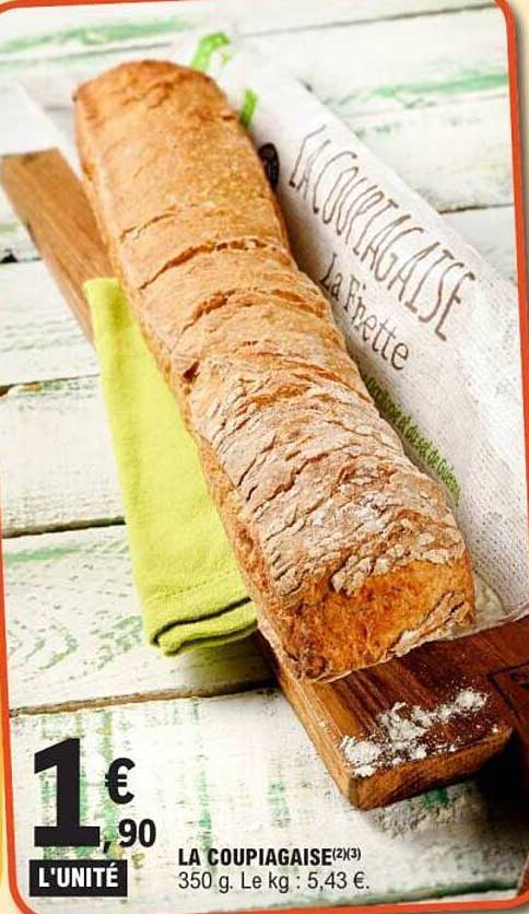 Découvrez la Coupagaise, un pain savoureux qui saura accompagner tous vos repas. Avec une croûte croustillante et une mie moelleuse, ce produit est idéal pour les pique-niques, les petits-déjeuners ou pour accompagner vos plats préférés. À seulement 1,90 € l’unité, c’est l’occasion parfaite pour ravir vos papilles sans trop dépenser.