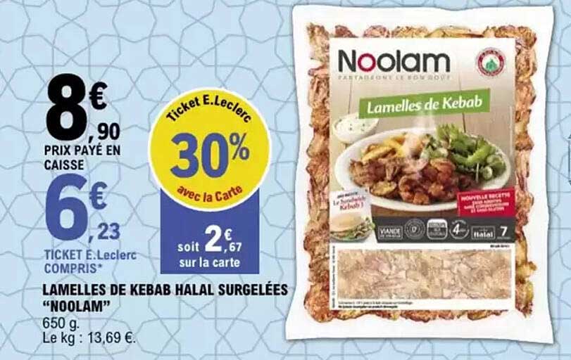 Découvrez l'offre de Lamelles De Kebab Halal Surgelées "Noolam" chez E.Leclerc! Cette offre fantastique est maintenant disponible dans le nouveau catalogue de E.Leclerc. Profitez de cette occasion et économisez considérablement sur votre achat.