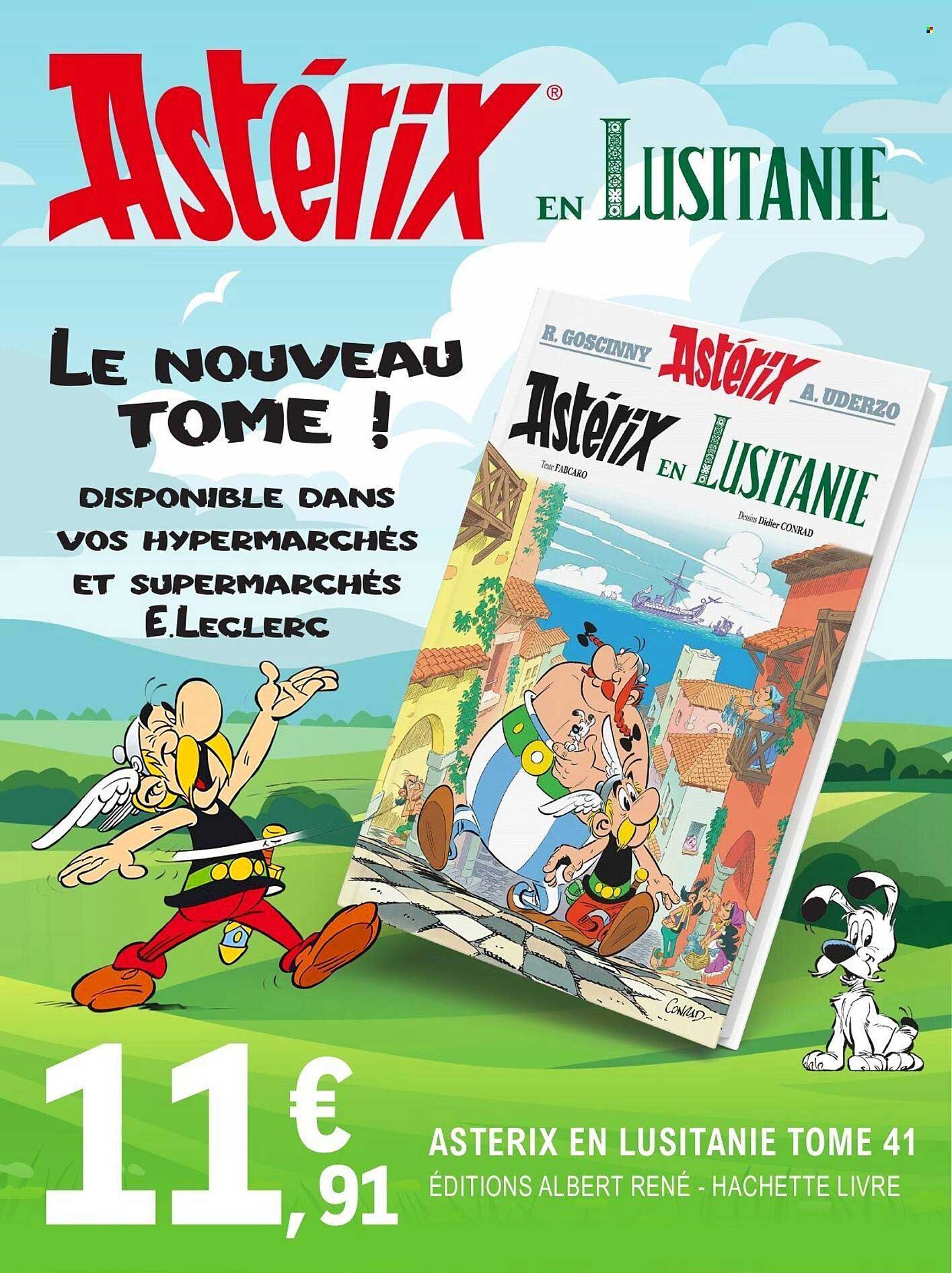 Découvrez le tout nouveau tome d'Astérix, intitulé "Astérix en Lusitanie". Ce chef-d'œuvre d'humour et d'aventure est maintenant disponible dans vos hypermarchés et supermarchés E.Leclerc. C'est l'occasion rêvée de plonger dans les nouvelles péripéties de notre gaulois préféré et de ses amis !