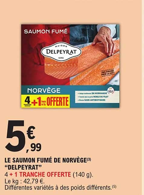 Découvrez l'offre de Le Saumon Fumé De Norwvège “Delpeyrat” 4 + 1 Tranche Offerte chez E.Leclerc! Cette offre fantastique est maintenant disponible dans le nouveau catalogue de E.Leclerc. Profitez de cette occasion et économisez considérablement sur votre achat.