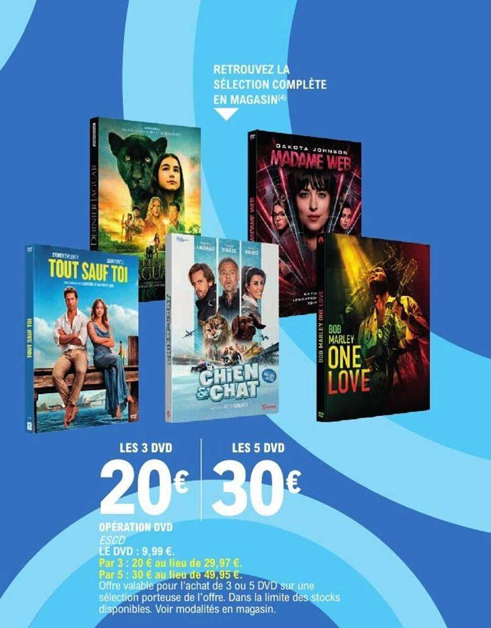 Découvrez l'offre de Les 3 Dvd 20 € Les 5 Dvd 30 € Opération Dvd chez E.Leclerc! Cette offre fantastique est maintenant disponible dans le nouveau catalogue de E.Leclerc. Profitez de cette occasion et économisez considérablement sur votre achat.