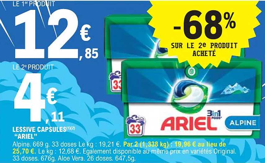 Découvrez l'offre de Lessive Capsules “Ariel” chez E.Leclerc! Cette offre fantastique est maintenant disponible dans le nouveau catalogue de E.Leclerc. Profitez de cette occasion et économisez considérablement sur votre achat.