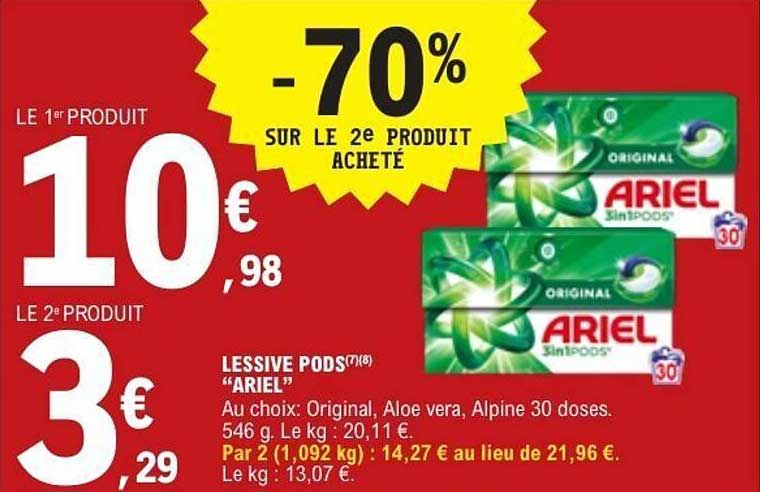 Découvrez l'offre exceptionnelle sur les lessives PODS 'Ariel' ! Avec une réduction incroyable de 70 % sur le deuxième produit acheté, cette promotion est idéale pour faire le plein de produits ménagers tout en réalisant des économies significatives. Les lessives PODS Ariel sont conçues pour offrir un nettoyage optimal et pratique, parfaites pour les familles ou les personnes en quête d’efficacité.