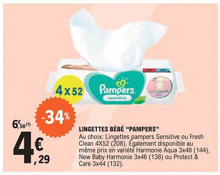 Découvrez l'offre de Lingettes Bébé “Pampers” chez E.Leclerc! Cette offre fantastique est maintenant disponible dans le nouveau catalogue de E.Leclerc. Profitez de cette occasion et économisez considérablement sur votre achat.