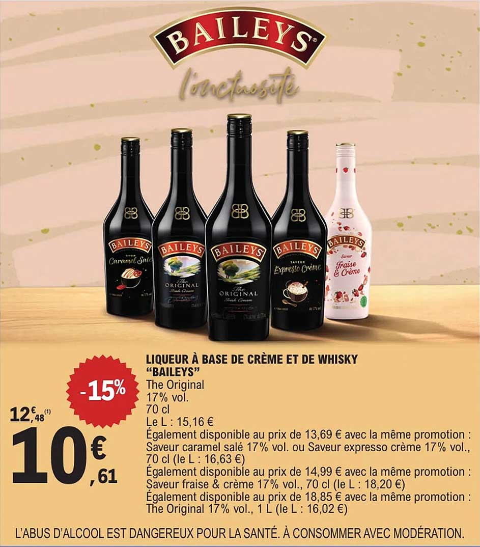 Découvrez l'offre de Liqueur À Base De Crème Et De Whisky "Baileys" chez E.Leclerc! Cette offre fantastique est maintenant disponible dans le nouveau catalogue de E.Leclerc. Profitez de cette occasion et économisez considérablement sur votre achat.