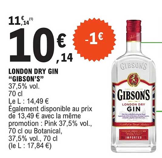 Découvrez l'offre de London Dry Gin "Gibson's" chez E.Leclerc! Cette offre fantastique est maintenant disponible dans le nouveau catalogue de E.Leclerc. Profitez de cette occasion et économisez considérablement sur votre achat.