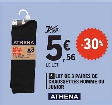 Découvrez l'incroyable promotion sur le lot de 3 paires de chaussettes scène par Athena ! Que ce soit pour le quotidien ou pour des occasions spéciales, ces chaussettes allient confort et style, parfaites pour hommes et juniors. Pourquoi ne pas en profiter ?