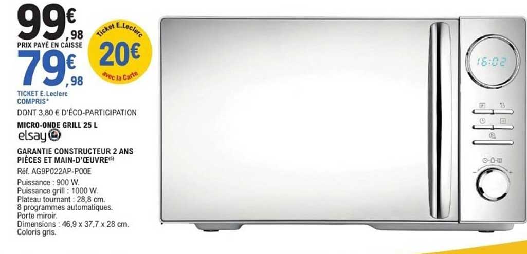 Actuellement proposé à 79,98 €, ce micro-onde est une offre à ne pas manquer, surtout quand on le compare à son prix habituel de 99,98 €. Avec une économie de 20 euros en utilisant votre carte E.Leclerc, cet appareil devient non seulement accessible mais aussi très abordable pour tous les budgets.