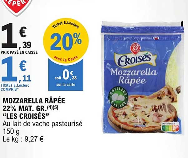 Découvrez l'offre de Mozzarella Râpée 22% Mat. Gr. (4/5) "Les Croisés" chez E.Leclerc! Cette offre fantastique est maintenant disponible dans le nouveau catalogue de E.Leclerc. Profitez de cette occasion et économisez considérablement sur votre achat.