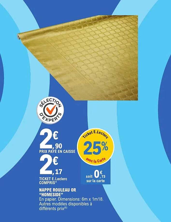 Découvrez dès maintenant la offre NAPPE ROULOE OR "HOMESIDE" dans le catalogue de E.Leclerc. Cette offre est valable du 10/12/2024 au 24/12/2024.