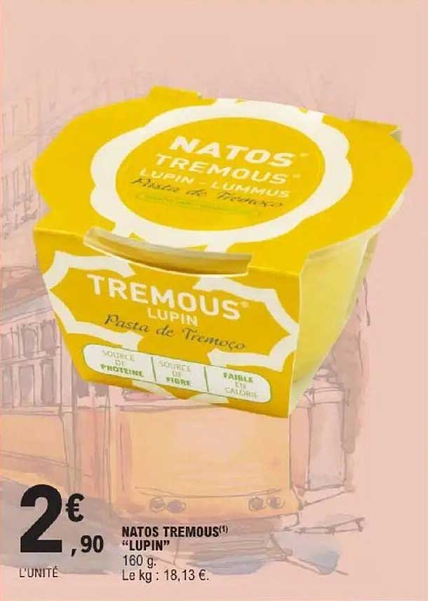 NATOS TREMOUS® est confectionné à partir de lupin, un ingrédient naturel connu pour ses nombreux bienfaits. Chaque portion de 160 g contient des ingrédients soigneusement sélectionnés, sans additifs artificiels. Avec seulement 2,90 € l'unité, vous bénéficiez d'un produit de qualité supérieure qui respecte vos besoins nutritionnels.
