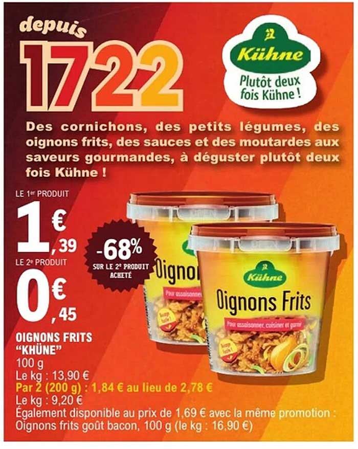 Vous êtes à la recherche d'un ingrédient savoureux pour agrémenter vos plats ? Découvrez les Oignons Frits "Kühne" proposés à un prix incroyable. Cette offre est non seulement une occasion de profiter de délicieux oignons croquants, mais aussi de faire des économies significatives sur votre budget courses. Valable du 10 au 14 juin 2025, cette promotion vous permet d’acheter des Oignons Frits de qualité à un prix réduit.