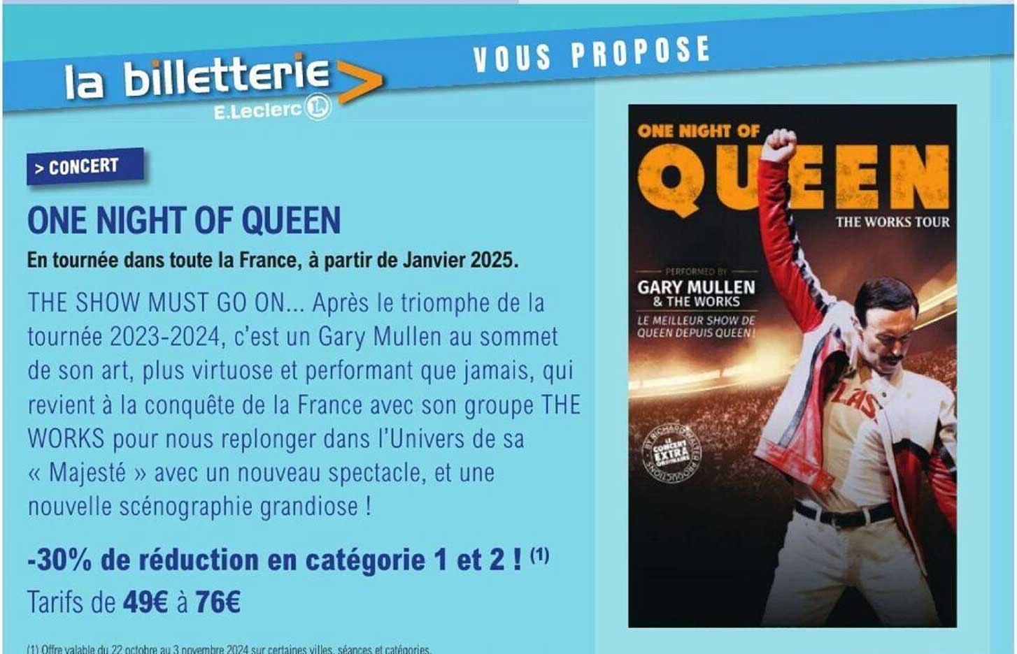 Découvrez dès maintenant la offre ONE NIGHT OF QUEEN dans le catalogue de E.Leclerc. Cette offre est valable du 22/10/2024 au 02/11/2024.
