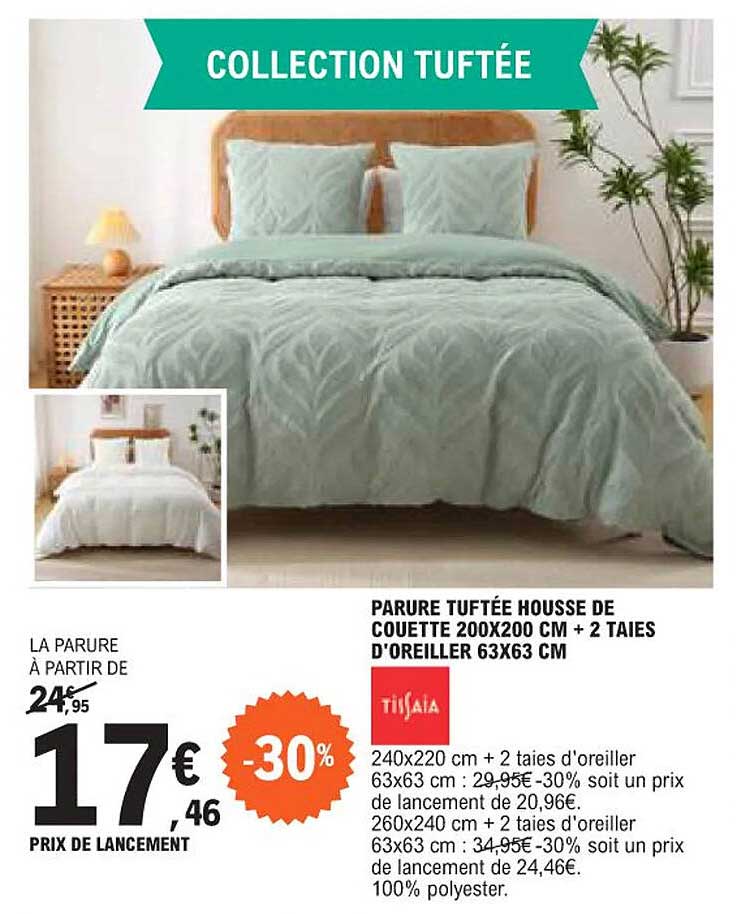 Découvrez dès maintenant la offre PARURE TUFTÉE Housse de couette 200X200 CM + 2 Taies d'oreiller 63X63 CM dans le catalogue de E.Leclerc. Cette offre est valable du 26/12/2024 au 11/01/2025.