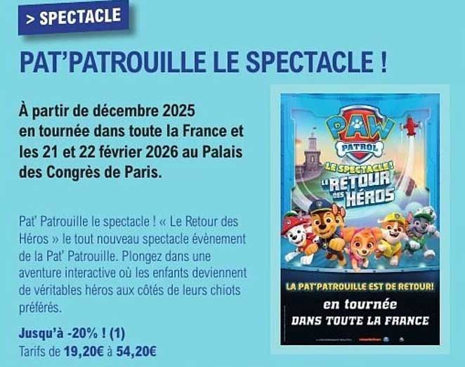 Découvrez dès maintenant la offre PAT’PATROUILLE LE SPECTACLE ! dans le catalogue de E.Leclerc. Cette offre est valable du 04/11/2025 au 15/11/2025.