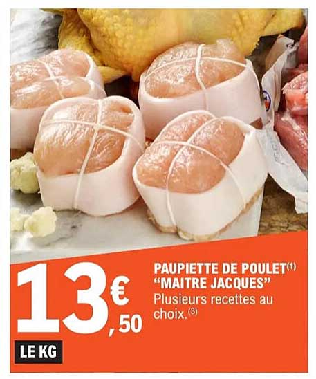 Découvrez dès maintenant la offre PAUPIETTE DE POULET "MAITRE JACQUES" dans le catalogue de E.Leclerc. Cette offre est valable du 28/01/2025 au 08/02/2025.