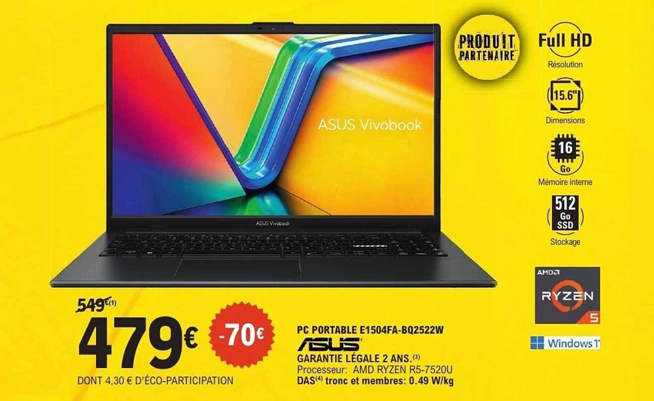 Découvrez dès maintenant la offre PC PORTABLE E1504FA-BQ2522W dans le catalogue de E.Leclerc. Cette offre est valable du 16/09/2025 au 27/09/2025.