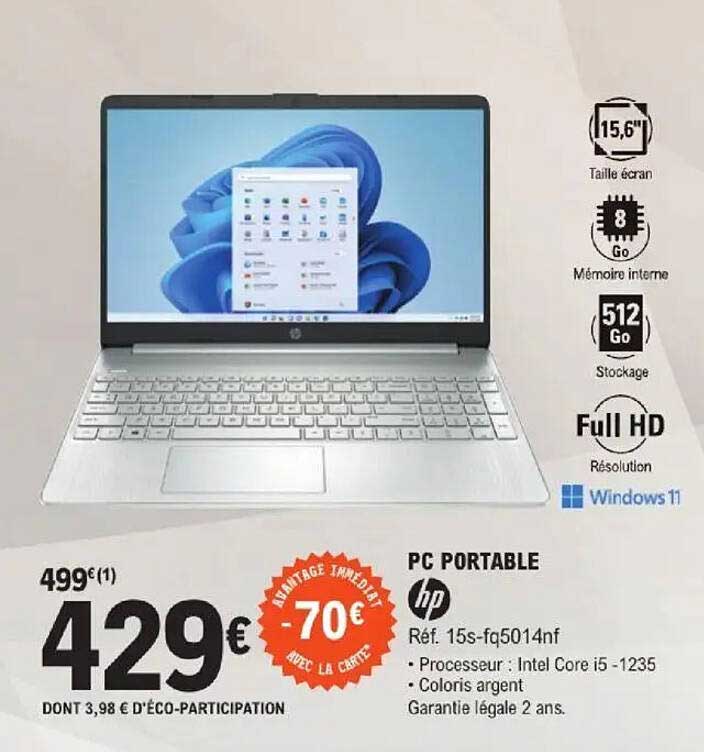 Découvrez dès maintenant la offre PC PORTABLE HP 15s-fq5014nf dans le catalogue de E.Leclerc. Cette offre est valable du 30/09/2025 au 11/10/2025.