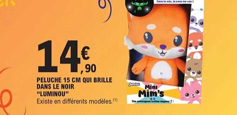 Découvrez dès maintenant la offre PELUCHE 15 CM QUI BRILLE DANS LE NOIR "LUMINOU" dans le catalogue de E.Leclerc. Cette offre est valable du 14/10/2025 au 26/10/2025.