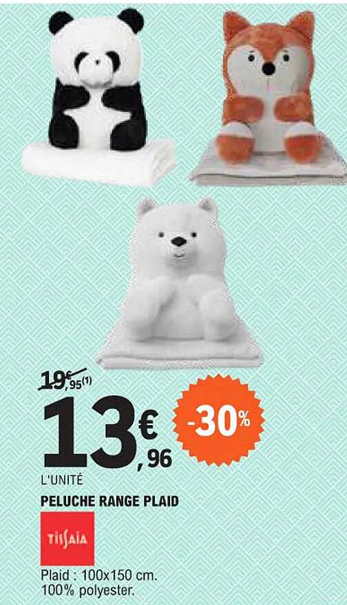 Découvrez l'offre de Peluche Range Plaid chez E.Leclerc! Cette offre fantastique est maintenant disponible dans le nouveau catalogue de E.Leclerc. Profitez de cette occasion et économisez considérablement sur votre achat.