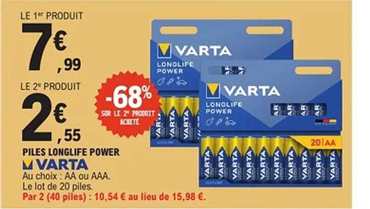 Découvrez dès maintenant la offre PILES LONGLIFE POWER VARTA dans le catalogue de E.Leclerc. Cette offre est valable du 18/11/2025 au 29/11/2025.