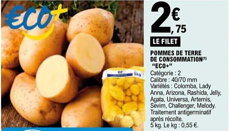 Découvrez l'offre de Pommes De Terre De Consommation(*) "Eco+" chez E.Leclerc! Cette offre fantastique est maintenant disponible dans le nouveau catalogue de E.Leclerc. Profitez de cette occasion et économisez considérablement sur votre achat.