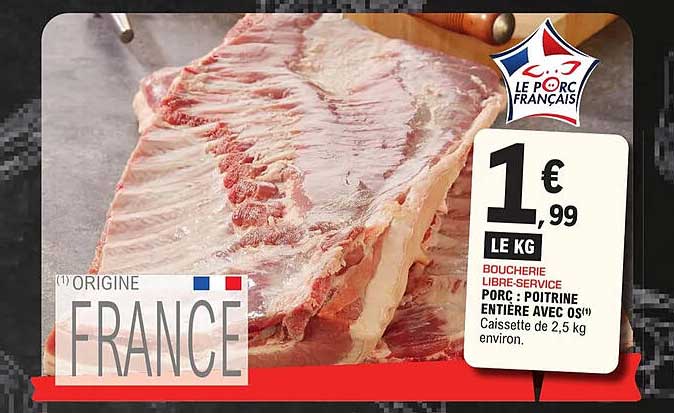 Découvrez l'offre de Porc : Poitrine Entière Avec Os chez E.Leclerc! Cette offre fantastique est maintenant disponible dans le nouveau catalogue de E.Leclerc. Profitez de cette occasion et économisez considérablement sur votre achat.