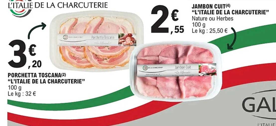 Profitez de la Porchetta Toscana à seulement 3,20 € pour 100 g, et du Jambon Cuit à 2,55 € pour 100 g, une belle occasion de faire des économies sur vos courses. Ces prix promotionnels vous permettent de savourer une charcuterie de qualité à un tarif exceptionnel.