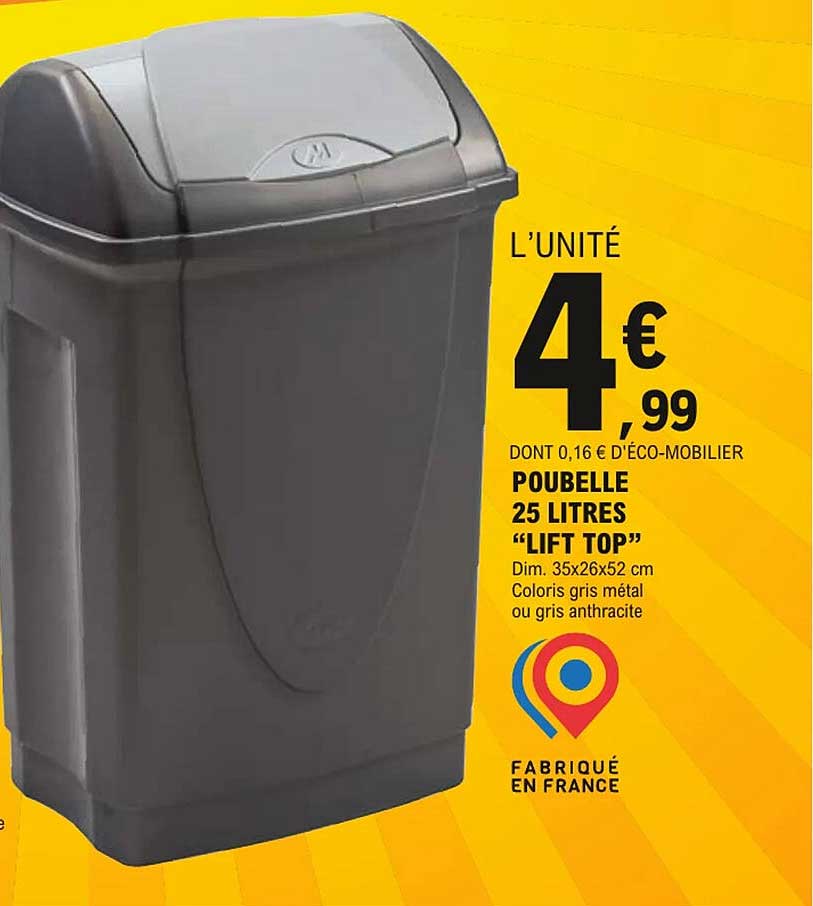 Découvrez dès maintenant la offre POUBELLE 25 LITRES "LIFT TOP" dans le catalogue de E.Leclerc. Cette offre est valable du 31/03/2025 au 06/04/2025.