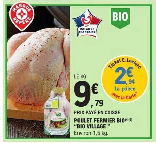 Découvrez l'offre de Poulet Fermier Bio "Bio Village" chez E.Leclerc! Cette offre fantastique est maintenant disponible dans le nouveau catalogue de E.Leclerc. Profitez de cette occasion et économisez considérablement sur votre achat.