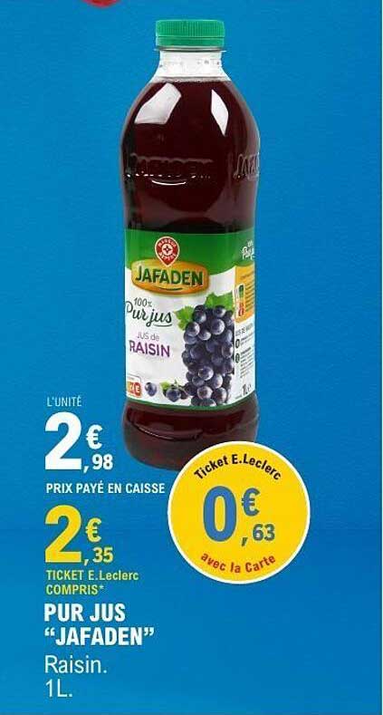 Découvrez dès maintenant la offre PUR JUS “JAFADEN” Raisin. 1L. dans le catalogue de E.Leclerc. Cette offre est valable du 04/11/2025 au 16/11/2025.