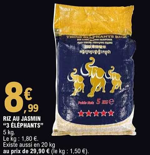 Découvrez l'offre de Riz Au Jasmin "3 Éléphants" chez E.Leclerc! Cette offre fantastique est maintenant disponible dans le nouveau catalogue de E.Leclerc. Profitez de cette occasion et économisez considérablement sur votre achat.