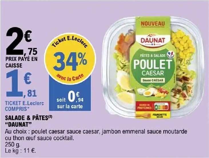 Découvrez dès maintenant la offre SALADE & PÂTES DAUNAT - POULET CAESAR dans le catalogue de E.Leclerc. Cette offre est valable du 08/04/2025 au 19/04/2025.