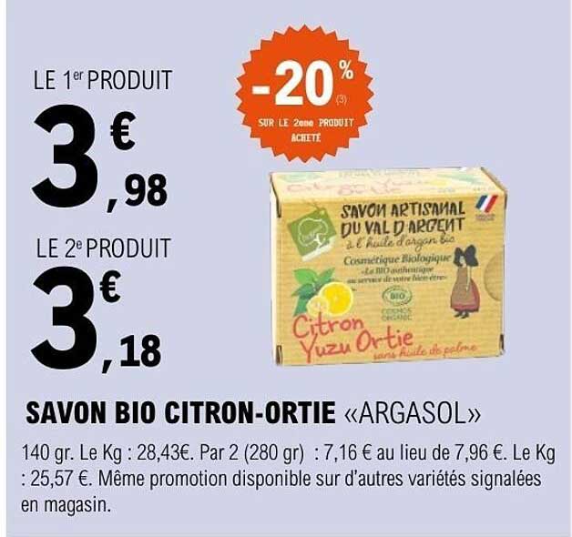 Vous cherchez une façon naturelle et efficace de prendre soin de votre peau ? Ne manquez pas cette offre exceptionnelle sur le savon bio Citron-Ortie d’Argasol. Disponible du 2 au 13 septembre 2025, ce produit artisanal allie l’efficacité des ingrédients bio à une fragrance fraîche et désinvolte.