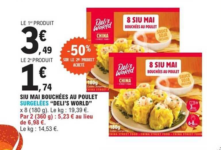 Découvrez l'offre de Siu Mai Bouchees Au Poulet Surgelees "Deli's World" chez E.Leclerc! Cette offre fantastique est maintenant disponible dans le nouveau catalogue de E.Leclerc. Profitez de cette occasion et économisez considérablement sur votre achat.