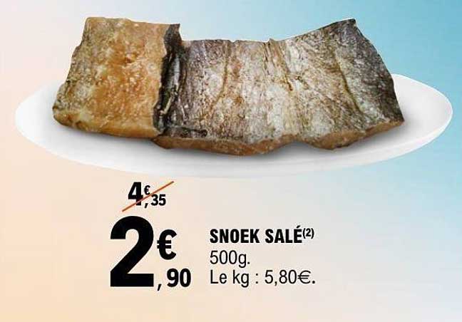 Actuellement, le snoek salé est proposé à seulement 2,90 €, au lieu de 4,35 €, ce qui vous permet de réaliser une économie substantielle. Avec un prix au kilo de 5,80 €, cette offre est à saisir absolument si vous êtes en quête de qualité à petit prix. Ne manquez pas cette occasion de vous régaler tout en faisant des économies !