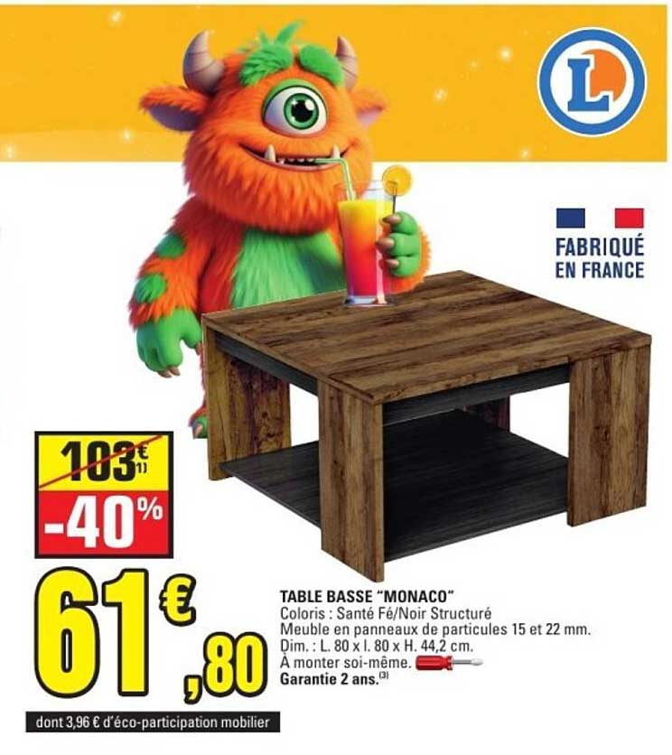 Découvrez dès maintenant la offre TABLE BASSE "MONACO" dans le catalogue de E.Leclerc. Cette offre est valable du 14/10/2025 au 25/10/2025.