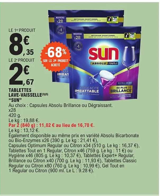 Offre de Tablettes Lave-Vaisselle “Sun” chez E.Leclerc