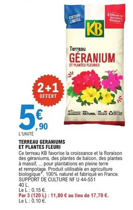 Découvrez l'offre de Terreau Géranium Et Plantes Fleuries chez E.Leclerc! Cette offre fantastique est maintenant disponible dans le nouveau catalogue de E.Leclerc. Profitez de cette occasion et économisez considérablement sur votre achat.