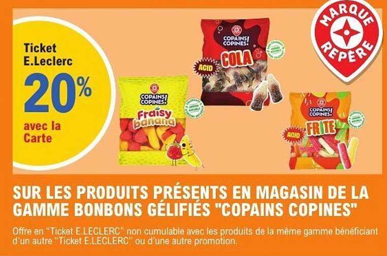Profitez d'une offre irrésistible chez E.Leclerc ! Du 21 octobre au 1er novembre, bénéficiez de 20% de réduction sur les délicieux bonbons gélifiés de la gamme "Copains Copines". Que vous soyez un amateur de saveurs fruitées ou de sensations acidulées, cette promotion est une occasion à ne pas manquer ! Imaginez les moments de partage autour de ces douceurs, à déguster lors de vos soirées entre amis ou en famille.